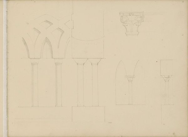 Editor: Here we have Georg Hoffmann’s "Roskilde Domkirke. Sideskib samt opstalt og snit af søjlekapitéler og -baser," from 1833. It's a pencil and etching print on paper. I’m struck by how meticulously rendered the architectural details are, but it feels very clinical. What do you see in this piece beyond architectural documentation? Curator: Well, let's consider what a cathedral represented in 1833, especially in a Danish context. Beyond religious space, these buildings are monuments to power, to centuries of socio-political stratification and wealth accumulation. Editor: So, the drawing isn't just a neutral depiction of architecture, it's also hinting at systems of power? Curator: Exactly. Think about the labor, the resources, and the sheer authority required to construct a cathedral like Roskilde. Hoffmann, even in this seemingly objective rendering, is capturing a specific moment in that history. What isn't shown is as important as what *is* shown. The lives of the builders are erased, rendered invisible through an image celebrating a power structure. Editor: That's a perspective I hadn't considered. So, looking at this, we could ask: whose story is being told, and whose is being left out? Curator: Precisely. And even beyond labor, there is a specific tradition Hoffmann situates himself in: Architectural drawing was and remains a field mostly occupied by men. Is there space here to draw from feminist theory and talk about the architectural gaze? Editor: That connection between representation and gender, and how it shapes what we see—fascinating. I’ll definitely be thinking about this differently from now on! Curator: Absolutely. The act of observing and recording is always a deeply political act, laden with societal values and meaning.