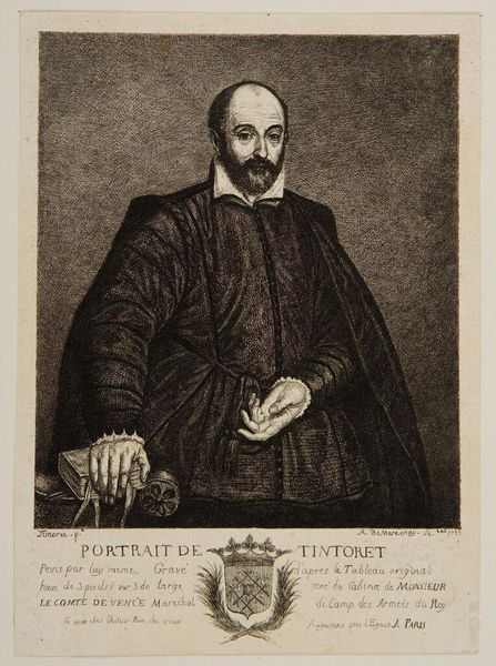 Editor: This is Pieter Clouet's portrait of Carolus Scribanius. It looks like an engraving. I'm struck by the level of detail and the cross in the background. What can you tell me about this piece? Curator: Considering its materiality, let’s think about printmaking in the 17th century. This engraving suggests a system of patronage and the dissemination of knowledge through reproducible images. How does the act of reproducing Scribanius affect his public image and legacy? Editor: That's fascinating! I never thought about it that way. Thanks for helping me see the bigger picture! Curator: Glad to share a different perspective! Considering the process helps us understand so much more.