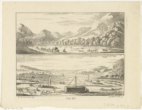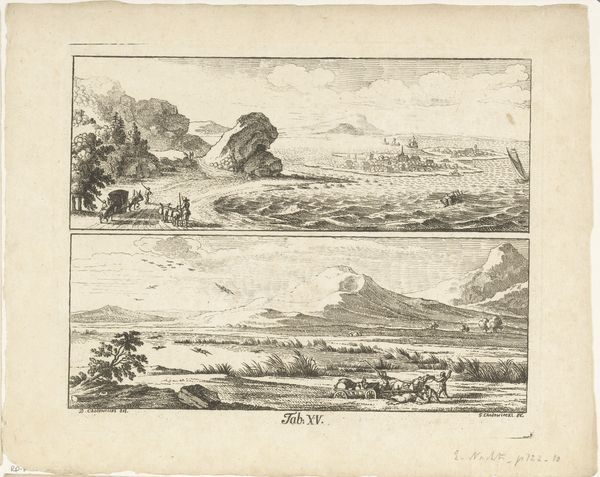Editor: This engraving, “Gezicht op Beez en Gezicht op Flawinne, 1740”, by Hendrik Spilman, depicts two serene landscapes. It feels almost like looking at postcards from the past. What stories do you think these images are trying to tell us? Curator: It's interesting you use the word 'postcards' – these aren't just neutral depictions, they are deliberate constructions embedded with cultural memory. These scenes act as visual anchors. The churches are prominently displayed – what do they suggest to you about the social importance and dominance of religion? Editor: I hadn't really thought of it that way. The churches definitely stand out. I guess they symbolize stability, perhaps? Curator: Exactly. And think about the strategic placement of these villages near water – vital trade routes and sources of life. Landscape imagery reinforced identity; ownership and order within the community, and for the wider state too. Even the clothing of the figures gives insight to status. It really underlines how the details coalesce into powerful visual cues. How would you characterise them now? Editor: So, more than just pretty scenery, they're encoding status and cultural importance through familiar symbols. Curator: Precisely! Every stroke of the engraver’s tool has a purpose; recording cultural priorities in enduring images that transcend mere representation. I wonder what people made of them at the time... Editor: It's amazing how much can be read into a seemingly simple image. I'll definitely look at landscapes differently now. Curator: Good. Art invites us to ask such questions and question those that have been asked for centuries. It encourages a continuous process of revealing layers of symbolic meaning over time, both personally and socially.