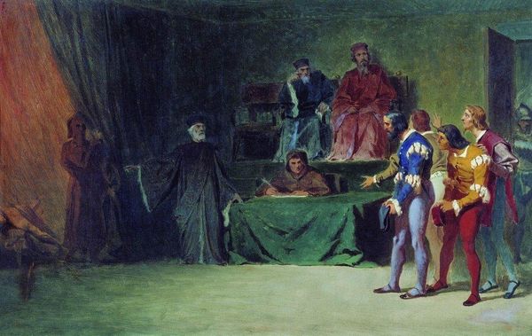 Fyodor Bronnikov painted "Mosaicists before the court three in Venice in the second half of the XVI century" using oil. The artist captures a judicial spectacle, a scene rife with symbols of power and vulnerability. Observe the Venetian officials, cloaked in crimson robes, symbols of authority and justice. The motif of judgment extends back to antiquity, echoing in the trials depicted in Renaissance frescoes and beyond, with similar scenes of judgement and accusation. The hooded figures on the left, reminiscent of the grim reaper, stir a deep sense of unease, a symbol of inescapable fate. The mosaicists, stripped and exposed, evoke both shame and the primal vulnerability of man, challenging our perception of justice. This evokes a powerful, subconscious connection to human emotion, a profound fear of helplessness. This echoes in art across the ages, from depictions of martyrs to modern expressions of human suffering. Through this work, Bronnikov taps into our collective memory, reminding us of the cyclical nature of power and the timeless struggle for justice.