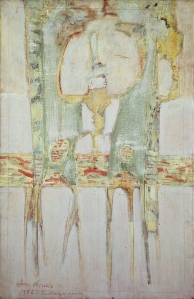 Jean Dubuffet made this painting, "The beautiful heavy breasts," using thick impasto to create a textured surface. The ochre and earthy tones give the figure a primal, almost archaeological presence. The composition is dominated by a monumental female form, its contours roughly hewn and imbued with a sense of rawness. Dubuffet deliberately eschews conventional beauty, favouring an aesthetic that celebrates the crude and the unrefined. This rejection aligns with his broader artistic project to challenge traditional notions of art and beauty. Consider how the title itself plays with irony, juxtaposing the idealised language of beauty with the painting's stark, almost brutal representation. Dubuffet engages with post-structuralist ideas, questioning the stability of meaning and representation. The work challenges fixed notions of the female form, creating a space for ongoing dialogue about perception, value, and cultural codes.