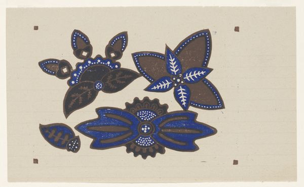 Editor: So, this is "Bloemmotieven," or "Floral Motifs," a woodblock print by Reijer Stolk, made before 1942. It's a striking image, almost like a page from a pattern book. It makes me think about folk art. What jumps out at you about the symbolic meaning behind these floral forms? Curator: It’s fascinating how Stolk uses the language of flowers to express not only beauty, but cultural memory. Before 1942 suggests the spectre of wartime, when the world feels upside down and images begin to function as dreams. How would you interpret the stark contrasts of light and shadow in relation to this historical moment? Editor: Hmm, maybe the sharp contrasts evoke a sense of unease, a world thrown into chaos? But these are still just flowers, right? Is there some connection to nature, resilience? Curator: Exactly. Floral imagery often represents hope, rebirth, and a connection to the earth. During times of turmoil, these symbols can become potent reminders of the cyclical nature of life, that even after destruction, beauty and growth can return. Look at the deliberate composition. Does that tell you something about the human need for order when surrounded by upheaval? Editor: That's a good point. The composition is very deliberate. Everything seems carefully placed, balanced almost. Maybe it's a subconscious need to find order in chaos, as you say, expressed through the image? Curator: Precisely! These seemingly simple floral motifs are so interesting because they give us a glimpse into the complex ways in which we process our fears and hopes. We remember continuity even within disruption. Editor: That’s a great insight. I’d never have thought of the print as a cultural artifact reflecting such troubled times, but now the title takes on a whole new layer of meaning.