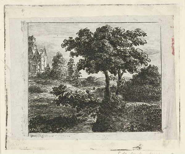 Pieter Louw created this drawing, "Klokhuis te Overveen," using pen in gray ink with gray wash. The composition presents a quaint, almost theatrical stage-like space, framed on either side by verdant trees. Louw's orchestration of light and shadow is striking. The gray wash, applied with varying intensities, creates a sense of depth and volume. Note how the diffused light lends a soft, dreamlike quality to the scene, obscuring details while accentuating the structural forms of the buildings. This treatment invites us to consider the semiotic function of light itself—how it reveals and conceals, creating meaning through its interplay with form. The scene destabilizes any fixed notion of landscape, suggesting instead a constructed space where the natural and the artificial are subtly interwoven. It's in this interplay that the drawing invites us to reflect on the constructed nature of perception itself, leaving us to question the boundaries between reality and representation.