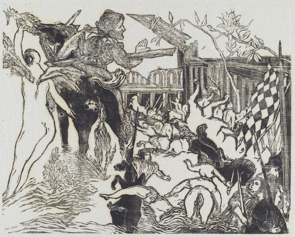 Curator: Bernard Reder created this ink print titled "Pantagruel: Livre V, Chapter XXXVI" in 1942. Quite a tumultuous scene, wouldn't you say? Editor: Absolutely, the monochrome palette accentuates the frantic energy. It’s gestural, visceral, almost chaotic in its composition. What am I actually looking at here? Curator: Well, Reder was deeply influenced by Rabelais's "Pantagruel" stories. This piece interprets a particular chapter, presenting a dynamic, almost theatrical representation of Rabelaisian adventure. Editor: I see that, the medium really underscores the sense of urgency, you know? The ink feels immediate, the linework raw. There's minimal shading, giving it a striking contrast. You can practically feel the hand of the artist and the work involved. Curator: He really captures that spirit, the blend of humanist ideals and folk traditions within those stories. Considering the date, 1942, one might read the turmoil as a response to the anxieties of the war, wouldn't you think? Editor: Good point, you know? Perhaps he chose printing for its replicative and almost democratic qualities, breaking down these classic forms for broader interpretation during wartime, as both solace and critique. How subversive it might be when he does something like this during the war, right? Curator: Precisely. It's also worth remembering that Reder, being a Jewish émigré, would've experienced that turmoil firsthand. "Pantagruel" and its rebellious spirit became personally pertinent to Reder, resonating in those years, definitely. Editor: Well said. Examining these ink strokes makes me feel the labor invested into this print. You know, the craft itself as an affirmation when faced with such profound societal disarray. Curator: A perfect synthesis, truly. This fusion, it's a profound meditation on both individual agency and historical moment, expressed with exceptional artisanal aptitude. Editor: A powerful convergence indeed, from a distant historical inspiration brought forcefully into Reder's world, expressed using such immediate materials.