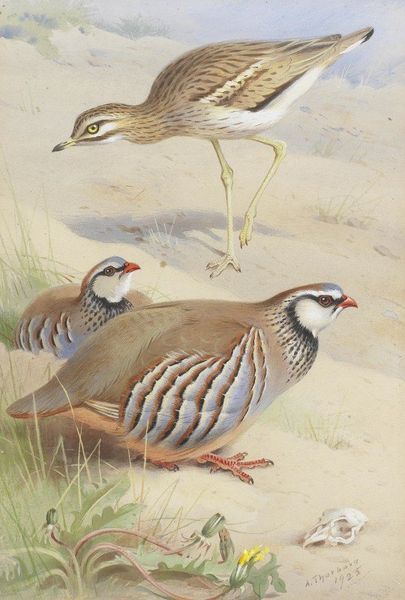 Here we see Archibald Thorburn's watercolor painting of English Partridges amongst Gorse and Thistles. The arrangement evokes a sense of calm, achieved through the softness of the watercolor medium and the birds' placid poses. Thorburn's composition is built upon a contrast between organic forms and more defined shapes. The partridges, each rendered with meticulous detail, huddle together in a semi-circle which draws the viewer's eye. The texture of their feathers is brought out by a masterful application of color, creating a tactile sense of their presence. In comparison, the gorse and thistles are drawn with a more abstract approach, their forms suggested rather than strictly defined. This contrast between precise detail and abstraction reflects a tension between observation and interpretation. Thorburn invites us not just to see but to contemplate the relationship between the natural world and its representation. The painting becomes a site where the real and the ideal intersect.