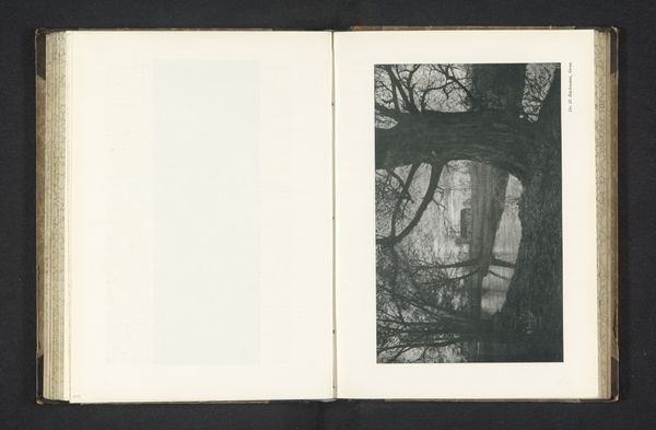 Curator: This piece is titled "Bospad," made before 1902 by A. Callier, crafted with a combination of print and photography techniques. Editor: Well, that's instantly moody. Like peering into a secret world only the trees know about. The contrast between light and shadow is striking. Curator: Exactly! It feels both intimate and vast, doesn't it? There's an interesting duality in the symbolism at play. The trees themselves, especially those gnarled branches reaching across the frame, are classic symbols of endurance, of weathering life’s storms. But look how they simultaneously obscure and reveal. Editor: You’re right, the light feels so calculated, like it's intentionally revealing just a peek of something beyond, something ethereal or maybe just… lost. What about that wall-like structure in the middle? Curator: Ah, I’m glad you noticed. It gives a sense of ancient permanence, like a relic reclaiming its spot, slowly being overtaken by nature. It grounds the composition in this realistic, tangible world. It evokes the tension between man's creations and the patient reclaiming power of the natural world. Editor: Hmm. Maybe I am reading too much into it, but the winding path – if that’s what that slight trail behind the trees is supposed to be – just disappears, giving it almost a sense of melancholy to me. The old photography methods certainly play a role here, don't you think? Curator: Absolutely. I imagine that the techniques of photography allowed artists like Callier to embrace that "realist" aesthetic by faithfully mirroring our perceived natural world while inviting an exploration into our individual experience of the same nature. It is a delicate balancing act of capturing what *is* while simultaneously asking the viewer what *could be*. Editor: Yes, I’d agree with that assessment of that balance. Callier managed to turn a realistic landscape into a scene that resonates on a deeply symbolic level, offering the viewer space for introspection. Curator: Beautifully put. It really underscores how even realist works, by emphasizing particular perspectives and forms, can invite incredibly personalized interpretations. Editor: It certainly has me pondering where that path leads.