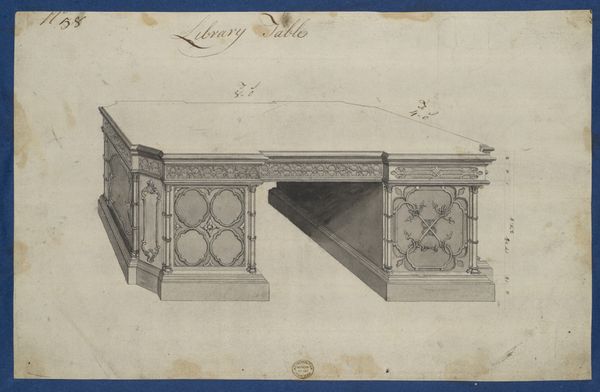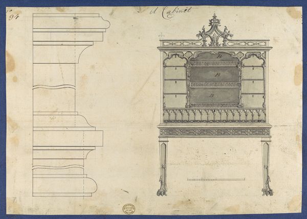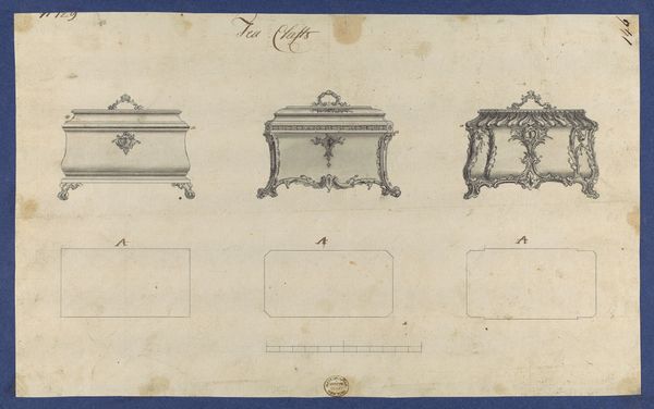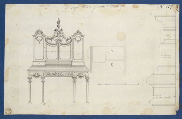 Curator: Right now, we're looking at "Sideboard Table, from Chippendale Drawings, Vol. II," a print and drawing made around 1753 by Thomas Chippendale. Editor: The thing that hits me first is the sheer aspiration of it. It's like a little drawing bursting with the dream of being a massive, impressive piece of furniture. Curator: Exactly. Chippendale, a master of decorative arts, wasn't just designing a table. He was presenting a vision, feeding the Neoclassical appetite for elegance and order. Look how the line work conveys a sense of lightness. Editor: But a controlled lightness, wouldn't you say? It’s the kind of lightness only money can buy. All those delicate embellishments are so consciously ornate and yet... so austere, like a king trying to be casual. Curator: It embodies a certain era of English aristocratic life and decorative aesthetic. We need to understand this in its original context. Museums today inevitably alter the power dynamics. But consider how designs like these reflected and reinforced a hierarchy of taste and wealth. Editor: So the sideboard is both an object and a statement? Like, "Look at this fabulous thing I can afford to put stuff on." It’s more throne than table? I can feel how such things influence power to this day. Curator: Perhaps that’s too cynical. What interests me, especially as a designer myself, is Chippendale’s exploration of form and space through his very precise craft. Editor: Well, maybe. It reminds me a bit of my old neighborhood, where everybody seemed to have the same gold-plated furniture and big, flashy mirrors. A yearning for an upper crust is not exclusive to any era, is it? Curator: Indeed. The object and the aesthetic ripple out influencing generation after generation. Thanks to Chippendale's ability to move from draftsman to creator, the legacy holds a solid foundation. Editor: Right, I am still chewing on how what’s on paper eventually transforms into the object… with some ego invested along the process.
