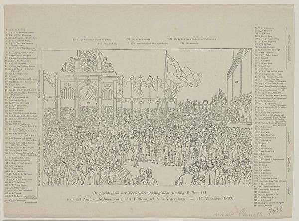 Carel Christiaan Antony Last created this print of King Willem III laying the foundation stone for a monument to commemorate the liberation from the French. The composition of the print is organised around a central architectural structure, which acts as a focal point. The use of linear perspective draws the eye deeper into the scene, effectively creating space, while the intricate detailing of the architecture and figures suggests a sense of depth. Last’s rendering is highly detailed and precise, emphasizing the importance of documenting this historic event. The subdued colour palette adds to the work’s documentary feel rather than detracting from it. This print reflects the 19th-century preoccupation with nationalism and historical commemoration. Last uses linear precision to carefully render the scene, communicating both the grandeur and the gravity of the occasion.