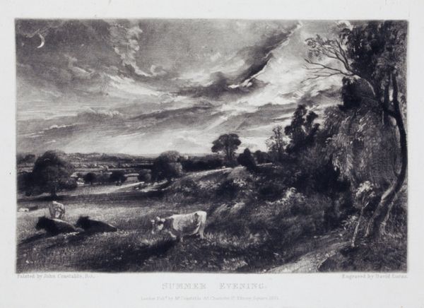 Editor: This is Samuel Palmer’s "Herdsman." I find the composition to be quite romantic, almost gothic, in its use of shadow. What is your perspective on this print? Curator: Palmer’s work emerged in a period grappling with industrialization. How might this idyllic scene, featuring a herdsman and cattle, be read as a commentary on urbanization and its impact on rural life? Editor: So, you're saying that he's presenting a contrast between urban life and a more traditional way of living? Curator: Precisely. Consider how Palmer's choice of subject matter and his intense, almost dreamlike style, position this work within a larger cultural conversation about progress and nostalgia. What do you make of the detail in the sky? Editor: It makes me think about the sublime, like a Turner painting. It’s interesting how the artwork is both romantic and makes a political statement. Curator: Indeed, the convergence of aesthetics and socio-political commentary is quite compelling here.