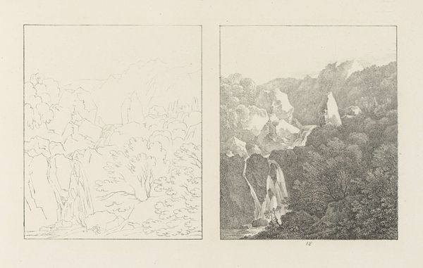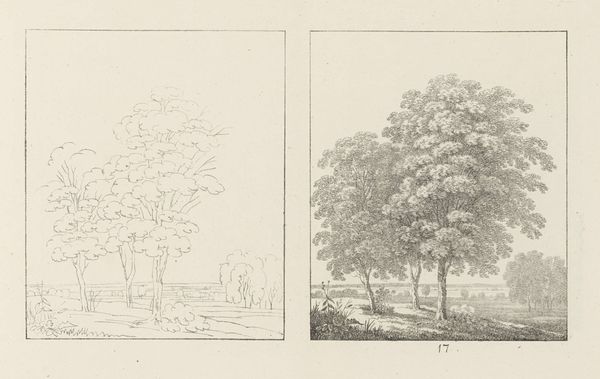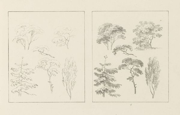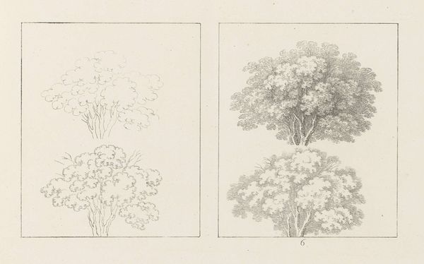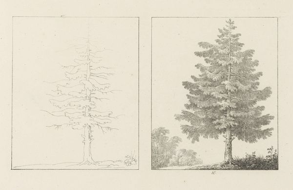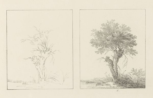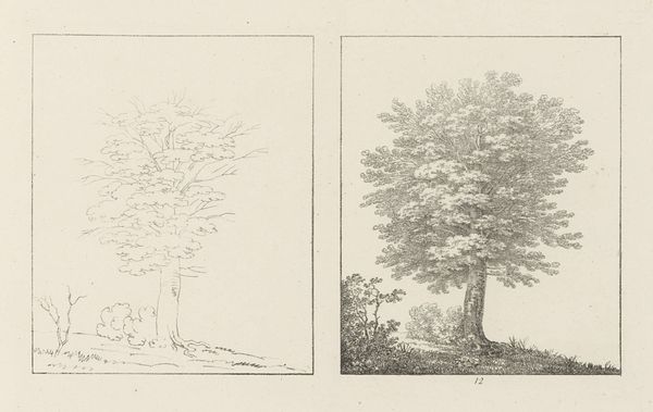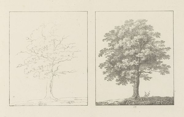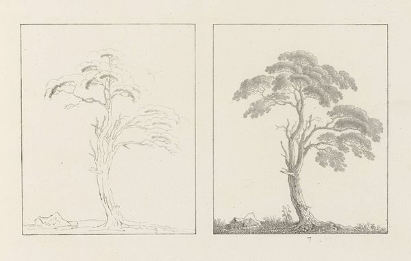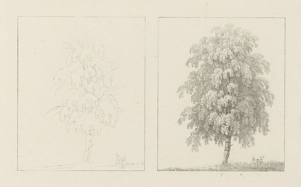 Editor: This drawing, "Albumblad met twee voorstellingen van twee treurwilgen" from 1816 by Max Josef Wagenbauer, depicts two weeping willow trees using pencil. What strikes me is the contrast between the sparse outline of the left tree and the fully rendered version on the right. How do you interpret this diptych? Curator: I see a dialogue here between intention and realization, reminding us that artmaking is never neutral. Consider the weeping willow, often linked to mourning and sorrow within European Romanticism. Wagenbauer, working in a time of political upheaval following the Napoleonic Wars, may be reflecting on themes of loss. Editor: So the incomplete sketch on the left... Curator: Represents perhaps the initial, raw feeling of sorrow? Then the fully realized tree on the right could symbolize the attempt to process that emotion, to give it form and meaning. Look at the careful shading, the individual leaves articulated. It's a visual representation of working through grief. Who do you think grief most affected during this era? Editor: Given the wars, I would guess mostly women. Perhaps wives, mothers and sisters of the fallen soldiers. Curator: Exactly. And consider too how the traditionally feminine association of nature provided a space for expressing those sentiments when social discourse limited their agency. The artistic act becomes a quiet but powerful act of defiance against imposed silences. Editor: That shifts my understanding entirely. I initially saw the contrast as purely technical, but now I see a powerful commentary on societal constraints and emotional processing. Curator: It’s precisely this interplay between form, content, and context that enriches our engagement with art. Keep questioning established narratives! Editor: I will, and thank you – this has completely changed how I see Wagenbauer’s work.