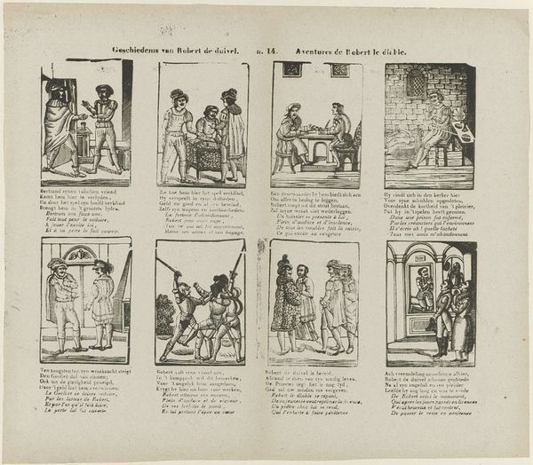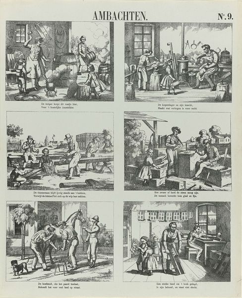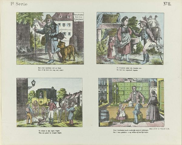 Curator: Here we have a print titled "Beroepen," created in 1873 by De Ruyter & Meijer. Editor: It's striking how the composition, divided into four vignettes, visually conveys societal tiers and individual professions, all rendered in stark black and white. Curator: Exactly. The print utilizes line engraving, common for mass production at the time, creating distinct tonal contrasts to differentiate each scene's narrative. We see scenes depicting different social strata at the time such as merchants, aristocrats and vendors. Editor: Looking at the depicted scenes, the materiality really jumps out. Each scene presents a snapshot of everyday life, yet it seems stylized. For example, we see people selling, trading, using a carriage. It evokes how labor, commerce, and luxury existed alongside one another within a community. It also reflects a kind of performative aspect of selling or bartering, reflecting social hierarchies. Curator: Precisely. Notice how each quadrant’s composition guides the eye. The carriage scene contrasts the beggar musician—evoking disparities of the haves and have-nots in a time when the industrial age made some wealthy and left others struggling. It's worth noticing the symbolic weight in those specific figures, the juxtaposition with others more affluent is really sharp. Editor: This print provides a layered commentary. The means of production are aligned with the visual communication, making it accessible to many. The artists' deliberate rendering allows for deeper discussion about the materials used and their resonance in different cultures. It challenges the traditional concept of art by intertwining the art form with aspects of social and economic significance. Curator: An astute observation. In essence, this artwork underscores how we might assess its design, arrangement, and symbolism—to then grasp social structures, too. Editor: And that's precisely how exploring both the creation and composition of an image like this helps unlock broader perspectives about life during its time.