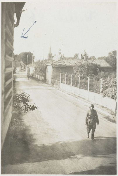 Editor: This is "China fair and wealthy," a gelatin silver print, possibly from 1908, by Geldolph Adriaan Kessler. I find the composition intriguing; the formality of the gate and building juxtaposed with the seemingly empty street creates a somewhat unsettling atmosphere. What formal elements stand out to you? Curator: The starkness of the gelatin silver print enhances the geometric rigidity of the architectural forms. Notice how the photographer positions the main building centrally, framed by the gate. This rigid structure is softened slightly by the organic forms of the surrounding trees, creating a visual push and pull between order and nature. Editor: The lines created by the telephone wires above also add another layer. Curator: Precisely. These linear elements, along with the geometric precision of the buildings, contribute to a semiotic reading of power and control. Consider the texture too – the rough, granular surface of the road contrasts sharply with the smooth facade of the building, further emphasizing a visual hierarchy. The gelatin silver print itself, through its tonal range, creates these striking juxtapositions. Editor: So, you're suggesting the photograph's meaning lies not just in the subject matter, but also in the way it is presented through composition, texture and the materials? Curator: Absolutely. By focusing on the intrinsic visual language – the interplay of lines, forms, and textures – we can begin to unpack its underlying structure and understand how it communicates its message. What new perspective does that structural analysis give you on the artist's intent? Editor: It’s less about the 'China fair and wealthy' as a record and more about a carefully constructed scene with particular relationships between hard and soft elements. I hadn't considered it that way. Curator: Indeed. Approaching art from a formalist perspective opens up layers of understanding, pushing us beyond superficial readings of subject matter.