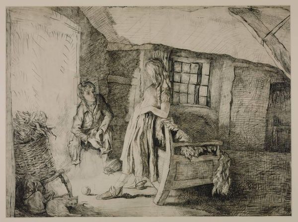 Curator: Thomas Rowlandson’s etching, "A Bed-warmer," likely created around 1785, depicts a rather chaotic domestic scene. What strikes you initially? Editor: The immediate impression is of asymmetry and tonal imbalance. The frenetic scribbles on the right contrast dramatically with the relative openness on the left. The female figure and her shadowed space compete with the bright disorder of the bed and its occupant. Curator: Indeed. Rowlandson was known for his caricatures and social commentaries. Consider the socio-political context of the late 18th century—the rigid class structures and burgeoning social anxieties are palpable. This print perhaps mocks the societal norms surrounding courtship and domesticity. Editor: Agreed, the scene reads satirically. Focusing on the formal aspects, note how Rowlandson uses varied line weights to suggest depth and texture. The lines describing the bedsheets are dense and chaotic, creating a sense of unease, almost entrapment, within the domestic sphere. Curator: Exactly! And consider the roles assigned. The woman, perhaps a servant or paid companion, attends to the man, highlighting gendered power dynamics prevalent during the era. Her upright posture contrasts with the man’s slouching demeanor, almost suggesting her control. Editor: From a formal perspective, observe the central placement of the figures within the composition, connected only through their shared space and the literal 'bed-warmer.' Yet, the hatching pulls my attention away, back towards the right, and out of this narrative. Curator: Precisely. It begs questions about women's roles, class, and the economy of servitude, issues deeply entrenched in Georgian society. The artwork invites conversations about these social realities and their visual representation. Editor: By drawing attention to these stark relationships of value—the bed-warmer, a token of the woman's service and position— the artist uses compositional arrangement as commentary. The piece doesn’t just represent; it embodies critical tensions. Curator: It’s this convergence of artistry and context, of aesthetics and social realities, that elevates this piece beyond mere illustration, turning it into a significant social document. Editor: Indeed, close analysis combined with an openness to those intersecting narratives is paramount. It enriches our understanding of both the art and its place in history.