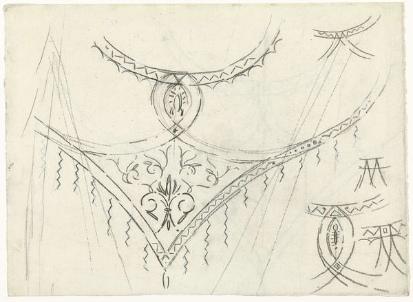 Curator: At first glance, this piece feels incomplete, like a fleeting architectural vision only partially remembered. Editor: What you're responding to is Gerrit Willem Dijsselhof's "Ontwerpen voor ornamenten," or "Designs for Ornaments" housed here at the Rijksmuseum. Executed in pencil and etching on paper, likely sometime between 1876 and 1924, it embodies the essence of Art Nouveau through simple lines and forms. Curator: Art Nouveau! Yes, now that you say it, I can definitely see that in the delicate yet bold lines! There's something both fragile and confident in the way it suggests ornamentation without fully defining it. Do you think that's intentional? Editor: It’s entirely plausible. Dijsselhof, working at the height of Art Nouveau's influence, saw the societal potential of art interwoven with everyday design. Designs like these offered architects and artisans a toolkit. Ornamentation held social power, it democratized beauty by weaving it into structures for all people. Curator: Democratizing beauty... I love that thought. It almost feels rebellious, challenging the elite by bringing artistry to the masses. The use of simple shapes—triangles, arches—does make it feel accessible, like anyone could pick up a pencil and contribute. I wonder, does the museum have other works of his to see how these sketches were put into use? Editor: The museum holds other designs of his that demonstrate this desire for accessibility. By examining the collection together we see he’s investigating form itself. Lines suggest rather than dictate the parameters of our perception, the relationship between order and fluidity that encapsulates Art Nouveau's revolutionary aesthetic vision. Curator: Thinking about it, those hesitant, zig-zag lines—they aren’t just decorative, they speak to an attempt to communicate the invisible, to sketch the immaterial sensations or a mood. Like capturing the shivers that run down one's spine standing beneath a soaring ceiling. Editor: I agree wholeheartedly. These sketches whisper rather than shout. The emptiness that remains evokes the power of Art Nouveau which offered beauty for all in simple forms, so anyone can participate. Curator: What a stunning thought to end on! To leave a legacy through quiet strokes, giving birth to beautiful possibility. Editor: Exactly, an idea etched gently for us to rediscover anew.