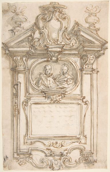 This drawing shows a design for an altar and reredos, but the artist remains anonymous. The sketch presents a vision for how sacred space could be adorned. The image is filled with cultural references that speak to its European context. The cherubic figures and ornate decorations suggest the influence of the Catholic Church. We can imagine this altar in the heart of a grand cathedral, serving as a focal point for worship and religious devotion. The institutional history of the church in countries like Spain, Italy and France will have played a role in shaping its aesthetic. This visual language would have been instantly recognizable to worshippers. By studying architectural drawings, we can understand the social conditions that shaped artistic production. Further research into religious history will uncover valuable insights into this sketch and its place within the broader cultural landscape. Art is contingent on social and institutional context.