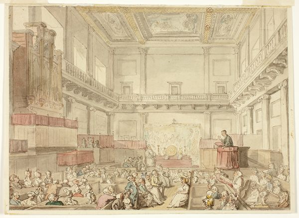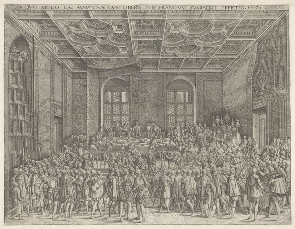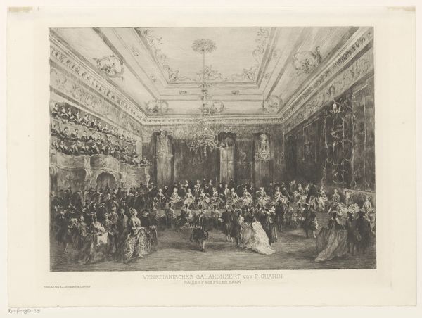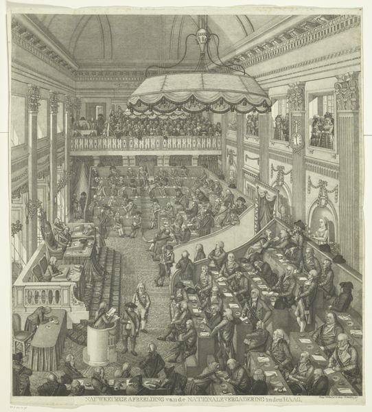 Editor: This is a print from the "Illustrated London News" in 1867, showing the Prince of Wales presiding at a meeting about the Paris Exhibition, held at the South Kensington Museum. It's interesting how many people are crammed into this one space! What do you make of it? Curator: What strikes me is how this engraving served as a form of mass communication. It's not just depicting an event, it's distributing a particular view of power and production to a broad audience. Consider the labor involved in producing this image: the engraver meticulously transferring the scene, the printing presses churning out copies. Editor: So it’s less about the Prince himself, and more about the labor and means of production around this event? Curator: Precisely! Look at how the architecture of the South Kensington Museum, designed to showcase industrial design, itself becomes a backdrop. It underscores how spaces of production – museums, exhibitions – were being constructed and consumed. Consider how the engraving medium itself dictated its style and reception. It circulated alongside news of the latest innovations, commodities, and fashions. It fueled the economic and social engine of the era. How do you view it now? Editor: It is kind of amazing to see this image and to understand how many people had to handle it for it to be distributed around England. I see it differently now, with this idea of mass production, a piece of media manufactured at scale. Curator: Exactly. Paying attention to its means of production is as vital as deciphering iconographic content. These historical images were embedded in a system of labor, and that really reshapes our perception of art!