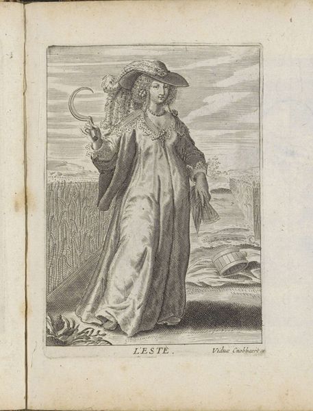 Editor: This engraving, “Reuk,” created sometime between 1600 and 1676 by an anonymous artist, feels very staged to me. It’s a depiction of smell, after all! What's your interpretation? Curator: I see the appeal in this depiction and I wonder, first of all, what kind of labor was required to create and then distribute it? Consider the engraver’s skill in translating the visual world into a series of precise lines, a process demanding intensive training. Editor: That's true. It does seem like it took a very long time to make. The amount of detail is fascinating! Curator: And beyond the manual skill involved, what about the social context that allowed such an image to be produced and consumed? These images would've likely circulated among a particular social class, indicative of specific tastes and desires tied to status and maybe a desire for sensory stimulation beyond the everyday. The very notion of capturing "smell" visually transforms an ephemeral experience into a commodity. The landscape, too, has been commodified. Editor: It’s interesting that you focus on the materials and labor. Curator: Don't forget how the engraving also intersects with the social hierarchies of the time. A figure amidst burgeoning global trade, maybe? Perhaps, she, like these images, is implicated in networks of resource extraction. I'd also be curious about the paper, its origins and what fibers are involved. Editor: I didn't consider it in terms of the labor involved to make both the physical item, but also the image, too. Curator: Exactly! These types of art challenge boundaries between high art and craft by forcing the viewer to examining labor, materiality, and consumption in general.