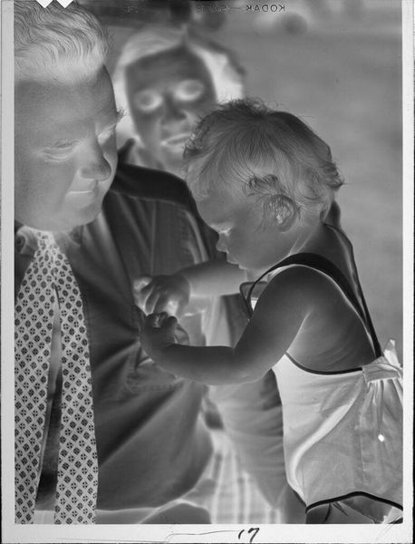 Curator: This striking photograph from the Harvard Art Museums is simply titled "Untitled (portrait of girl holding baby)" by Lucian and Mary Brown. Editor: It's an unsettling image. The inverted tones give it an almost spectral quality. What do we know about the context of its making? Curator: Details are scarce. Absent of a specific date, it's difficult to ascertain the image's social context. It does, however, underscore the evolving roles of women photographers within institutions. Editor: The contrast between the two figures speaks volumes. The older girl's formal attire and direct gaze juxtapose with the baby’s apparent vulnerability, stirring complex emotions about familial duty. Curator: Perhaps. This photo offers a glimpse into the artistic practices of the Browns. Editor: Ultimately, this photograph is about more than just aesthetics; it's a visual artifact of its time.