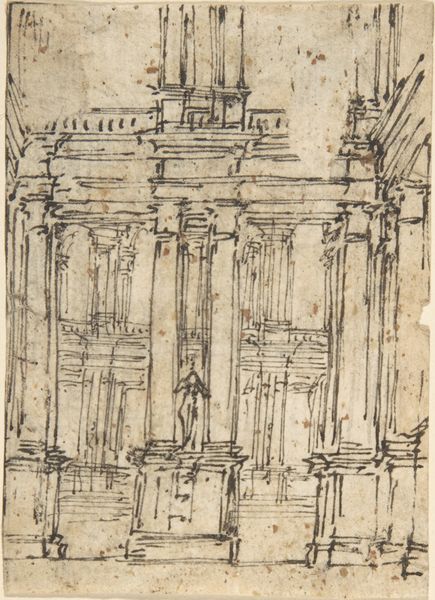 Curator: Look at the dynamism within the lines! What springs to mind for you? Editor: Initially, it evokes a feeling of immense space and somewhat daunting grandeur, maybe even an unfinished stage set, all in shades of umber. What can you tell me about it? Curator: This is a 17th-century drawing entitled "Design for a Console supported by Putto," though on the reverse is an "Architectural Arcade." The artist is, unfortunately, unknown, and it's crafted with pen and brown ink, now residing here at The Met. Editor: It’s intriguing how the arcade feels almost infinite, perspective creating this repetitive echoing effect, wouldn't you agree? But how does it tie to cultural symbols of its time? Curator: Well, architectural drawings from this period often alluded to power, order, and the ideals of the Renaissance – a return to classical principles, visibly demonstrated through columns and archways and structural form. It speaks to a human desire to structure their world. Editor: True. But note how the artist’s technique – thin lines, repeated shapes – almost deconstructs those very ideas. The lightness defies the weight and the possibility of function or structure. Curator: An apt observation. These were design sketches, intended to spur development for wealthy patrons, the rising class that sought stability to mirror societal expectations through the facade and motifs of architectural designs. This connects with aspirations and control. Editor: I can almost imagine the architects sketching in real-time, fueled by new patrons and Renaissance idealism to create structures. It bridges the practical with profound symbol. Curator: Indeed. The architecture shows cultural and personal projections to make order through both technique and composition. Editor: Seeing the bones of this, deconstructed – or still emerging – in such a skeletal structure challenges conventional perceptions and opens endless avenues of meaning for this architect. Curator: I concur.
