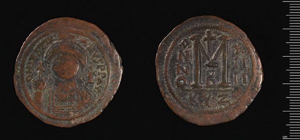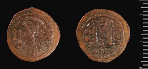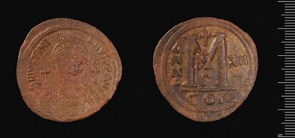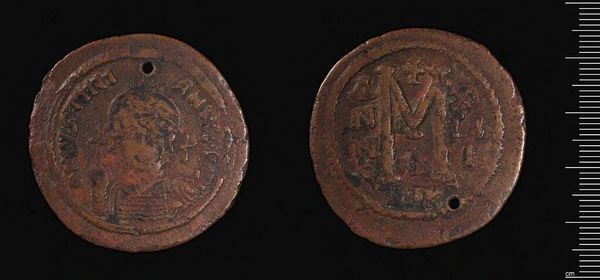Curator: Here we have a bronze coin of Justinian I, now residing at the Harvard Art Museums. Editor: The patinated surface gives it such weight and presence. The raised design, despite its wear, still reads with such graphic power. Curator: Indeed, this coin served not only as currency but also as propaganda. Justinian's image reinforced his authority and divine right to rule. Editor: Note the simplification of form, how the rigid lines create a sense of order and power, even in miniature. Curator: And the placement of the "M" on the reverse – a symbol of value but also a nod to imperial might, circulated widely throughout the Byzantine empire, shaping perceptions of Justinian's reign. Editor: It's fascinating to observe how a simple object can communicate complex ideas about power and value. Curator: Absolutely, a tangible piece of history that continues to spark conversation.
