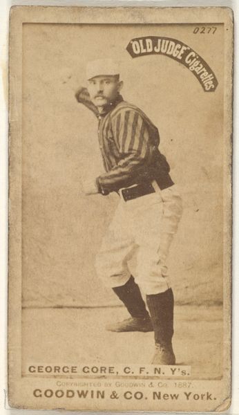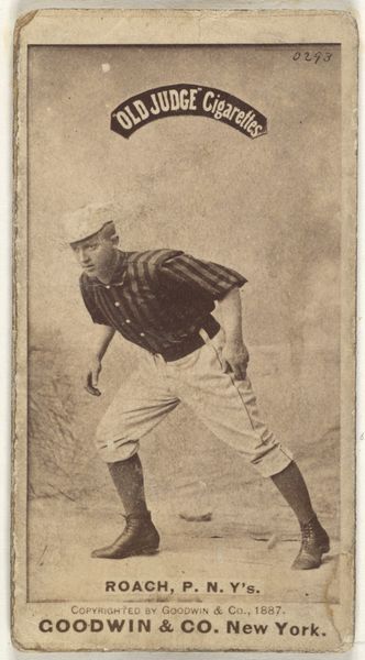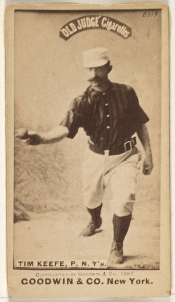 This is Timothy John "Tim" Keefe, Pitcher, New York, a baseball card from the Old Judge series made around 1887 by Goodwin & Company, as part of an advertising campaign for Old Judge Cigarettes. During the late 19th century, baseball emerged as a popular form of entertainment, largely among working-class men. These cards, distributed with cigarette packs, captured the players' images and brought them into people's everyday lives. The representation of athletes like Keefe spoke to ideals of masculinity, physical prowess, and the burgeoning concept of the sports hero. Keefe, a celebrated pitcher, is depicted in action. What does it mean to capture his image in this way, turning a working-class hero into a commodity to be bought and sold? The mass production and distribution of his image reflect the evolving dynamics of fame, consumer culture, and the commercialization of sports during this era. In considering this baseball card, we might reflect on how it embodies both individual aspiration and collective identity.