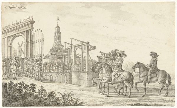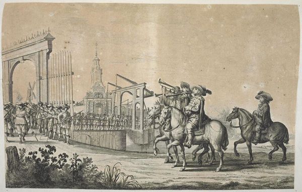 Curator: Let’s turn our attention to this print, “Entry of Marie de Medici into Amsterdam,” crafted by Pieter Nolpe in 1639. It’s one plate of a series of six, detailing Marie's ceremonial arrival. What impressions does it stir in you? Editor: Oh, the weight of history, etched right onto the paper! I'm immediately struck by how stiff and formal everyone seems. It's all trumpets and perfect posture, but I wonder what they were really thinking. It’s like a highly choreographed performance where everyone knows their place and plays their part. Curator: That formality is intrinsic to Baroque art, emphasizing spectacle and power. Consider the choice of an engraving. The medium lends itself to crisp detail, reinforcing the intended message of control and grandeur. And the cityscape teems with significance. Editor: The composition is quite compelling. The approaching procession, flanked by that elaborate gate and distant windmill, creates this wonderful sense of depth. It also positions the viewer as being part of this event, drawing you into this unfolding historical narrative. Do you feel, too, like a face in the crowd? Curator: Precisely. The triumphal arch mirrors Roman precedents, invoking associations with imperial authority. The architecture, from the meticulous detail of the church spire to the drawbridge, asserts Amsterdam’s strength and order, the solid burgher establishment. Editor: It's amazing how much visual storytelling Nolpe crams into one image, like reading a historic headline. What strikes me is this slightly absurd contrast, this regal entry set against what appears to be just a regular bustling city. Royalty among the mundane! It injects, in my mind, humanity into this otherwise imposing ceremonial. Curator: Perhaps, indeed. Nolpe captures not only a record of a state event but a convergence of ambition, expectation, and the ever-present undertones of ordinary life going on regardless. This, perhaps, underscores the cultural memory attached to historical subjects such as these. Editor: I'm glad we lingered here. It's a reminder that every formal procession contains multitudes: the official story, the personal dramas, and the everyday world continuing its own course around it all.