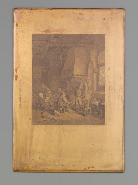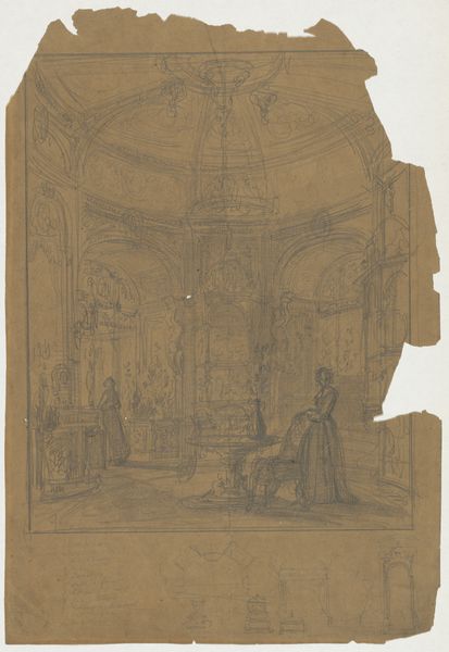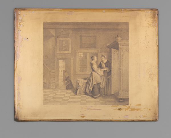 Editor: So, this is Johann Wilhelm Kaiser’s "De luistervink," which roughly translates to "The Eavesdropper." It’s an etching made with pen on paper sometime between 1823 and 1900. I’m immediately struck by how it captures a stolen moment, almost like a secret caught on paper. How do you interpret the social commentary here, especially regarding privacy and public life? Curator: That's a fantastic initial observation. The act of eavesdropping depicted reflects anxieties surrounding social spaces and control. Considering its creation during the 19th century, what socio-political narratives about class or gender could be embedded within this "stolen moment?" Does this peeking figure disrupt a narrative of domestic order, for instance? Editor: Well, the eavesdropper looks like a domestic servant, right? So perhaps it speaks to a power dynamic within the household – a commentary on those who are constantly observing yet remain unseen themselves? Does the setting, with its arches and obscured views, play into this theme of surveillance and hidden lives? Curator: Precisely! The architectural space becomes a stage for observing power structures. Those arches create frames within frames. What does it mean that the viewer is also in a way "eavesdropping" on the scene through this artwork displayed in the Rijksmuseum? We become implicated in a kind of perpetual voyeurism. Editor: So, it’s not just about the depicted eavesdropper, but the museum environment encourages visitors, like myself, to become a kind of 'luistervink' ourselves? I hadn’t considered that. Curator: Exactly! Think of the Rijksmuseum, in this context, as another structure framing and legitimizing a certain way of seeing, a particular social and political lens through which we interpret this image. It pushes us to question the role of institutions in shaping perceptions and even behaviors around concepts such as privacy. Editor: That’s fascinating. It really changes how I view genre paintings in museums – not just records of everyday life, but also reflections on power, observation, and even the act of viewing itself. Thanks, that perspective makes a world of difference!