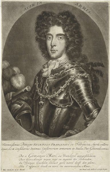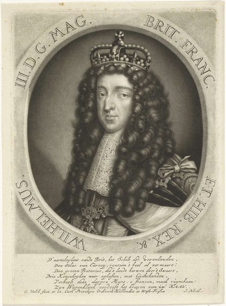 Curator: This is Jacob Gole's portrait of Willem III, Prince of Orange, dating sometime between 1688 and 1724. It's an engraving, showcasing the prince in his full regal attire. Editor: It's quite striking. All that dark etching gives it such a serious and frankly opulent feel, but in a very controlled manner, a typical sign of the Baroque aesthetic. Curator: Indeed. Consider the sheer skill and labor involved in producing an engraving like this. The repetitive actions required to create the intricate lines and textures – each etched into a metal plate, inked, and then pressed onto paper. The materiality of ink, paper, and metal plate, and the craft involved, speak volumes about the value placed on representation. Editor: And representation for whom, right? Context is vital here. This isn't just an image of a ruler, it’s an articulation of power deeply entwined with issues of identity and authority. The wig, the crown, even the scepter – all these are designed to project a certain image. Let's not forget William's complicated role in British history and the complex narratives that arise from colonization, and resistance, when viewing art of this period. Curator: Precisely. The crown and royal garb clearly symbolize power and the means of governance but let's delve deeper into the craftsmanship. Consider the production networks involved, from the paper mill to the workshops crafting his garments, the raw materials to finished state: Dutch linen, English wool, precious metals, gemstones. All interconnected threads woven into a display of authority. Editor: Absolutely. Power isn’t simply declared; it's performed. Gole's portrait allows us to deconstruct these performances and reveal the assumptions around legitimacy that still operate today. The symbolism extends to understanding the very circulation of these prints and who had access to such material representations of authority and its place within a broader landscape of visual propaganda. Curator: It is an impressive display of the technical ability required of engravers during the Dutch Golden Age. Editor: I concur; it compels us to delve beneath surface appearances. I leave contemplating not just Willem III's image, but how that image functions, still. Curator: Exactly, and understanding the economic drivers of artistic patronage and the intricate systems supporting this kind of work.