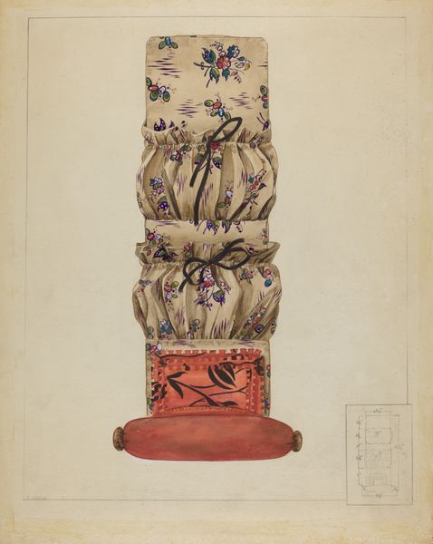 Curator: I'm immediately struck by the charm and naive beauty of this drawing. There’s something so comforting in its simplicity. Editor: Indeed. What we have here is "Purse," a watercolor and drawing on paper created by Mabel Ritter around 1936. It's an intriguing example of decorative folk art, offering a glimpse into vernacular artistry of the period. Curator: The drawing…it has such a tender feel. I love the pink bow. Do you get the sense it’s like a template or maybe design study for an actual purse? The stitchwork and detailing seems really meticulous but idealized. Editor: That's precisely right. These types of drawings were common during the WPA era. Artists often produced renderings of handicrafts for documentation or potential replication as part of the government’s support programs. The almost hyper-realistic representation suggests an intention for detailed production. Curator: Right, like instructions for an imagined artisan! The folk art element gives it a sense of place, the homes are giving cozy vibes. Then we’ve got the blue fringe that feels like rain…It is so descriptive. Editor: Absolutely. The motif of the houses beneath the vibrant flora, bordered with that chromatic zigzag and whimsical blue fringe suggests a certain narrative—an attempt to render the everyday sublime through simple forms and radiant color. Also the pink and white lines that almost looks like toothpaste. Curator: Totally. But I wonder if it could even be about the hidden labour behind supposedly "folksy" charm. Like we get this warm glow when we see the picture of this bag. But we fail to imagine who, or how, it’s getting manufactured. Editor: That's a perceptive reading. It underscores how folk art can be appropriated, commodified, and idealized without recognizing the labor and socioeconomic conditions of those creating it. This drawing stands as a stark yet gentle reminder. Curator: Yeah, a complicated nostalgia bottled in a candy-coated drawing. Editor: Yes, candy coated it is. Perhaps this sweet lens has sharpened my eye to history.