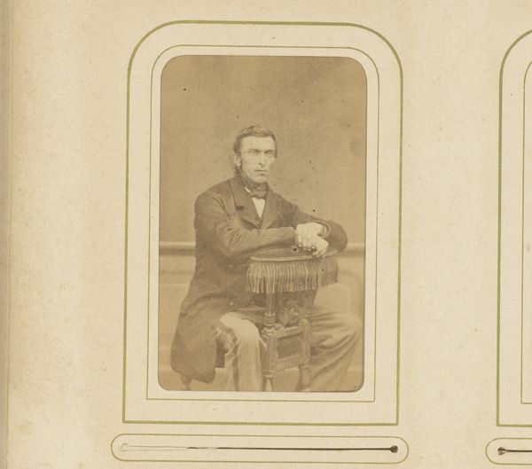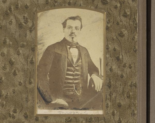 This is 'Portret van een man' by Jouve, a small portrait encased in patterned card. The sepia tones cast the scene in a light of times past. The subject is positioned centrally, drawing the viewer's eye immediately to his face. The rigid composition suggests a formal pose, typical of early portrait photography, and is heightened by his suit and bow tie. The patterns around the image, however, soften this formality. The texture and depth achieved through the monochrome palette invite us to consider the play of light and shadow. This image reflects photography's shift from capturing mere likeness to exploring artistic expression, emphasizing the interplay between form and representation. The contrast between the structured portrait and the abstract background questions the very nature of representation. The composition invites ongoing interpretation, echoing how photographic meaning evolves over time.