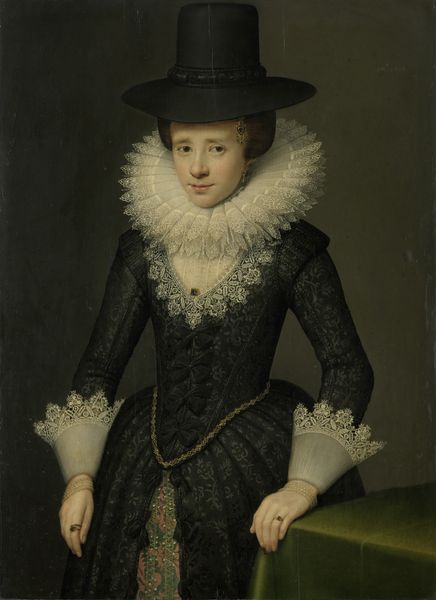 Salomon Mesdach painted this portrait of Margarita Courten, likely around the middle of the 17th century, in oil on canvas. While portraits are usually about likeness and status, this one also speaks volumes about the labor involved in creating the fashionable garments of the time. Consider the intricate lace collar and cuffs; these were bobbin-made, a painstaking process involving hundreds of threads and pins. The patterned fabric of the dress itself may be silk damask, also requiring specialized looms and skilled weavers. The details of clothing making are critical to how the sitter is perceived, reflecting her family's wealth and status. The very darkness of the dyes would have been expensive to achieve, an implicit signifier of class. So, next time you look at a portrait like this, remember that the painter's work is only half the story. The rest is a testament to the many artisans who made such a striking image possible.