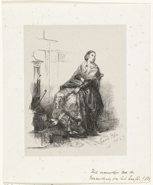 Reinier Craeyvanger made this print, "Seamstress and Violin Player," using etching, a printmaking technique, around the mid-19th century. Etching involves coating a metal plate with a waxy, acid-resistant substance, then scratching an image into the wax. When acid is applied, it bites into the exposed metal, creating lines that hold ink. The printmaker then applies ink, wipes the surface clean, and presses paper against the plate to transfer the image. Here, the fine, closely-spaced lines evoke the textures of fabric and the soft light in the room. Note the contrast between the detailed foreground and the shadowy, indistinct figure of the musician. Craeyvanger’s choice of etching speaks to the burgeoning print culture of his time, as the industrial revolution was making images more widely accessible, but still requiring a highly skilled hand to produce. In this context, it's worth asking: Whose labor is visible, and whose is obscured? The seamstress, diligently at work, contrasts with the almost ghostlike violinist, raising questions about visibility, class, and artistic creation.