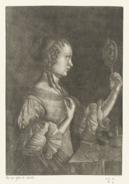 Curator: This engraving is titled "Smaak," dating somewhere between 1709 and 1755, crafted by an anonymous artist. What's your initial reaction to it? Editor: I am struck by the intimacy of the moment, although that term, 'intimacy' might seem exaggerated in light of its somewhat formal composition, and in particular, that almost performative stirring of the cup with that rather dainty little spoon. There's also an interior, private quality here, as though we have trespassed on a ritual. Curator: You mention ritual, and that’s key. Look closely at the details surrounding the figure. Note the presence of that almost theatrical backdrop of the tree and the landscape. Observe also that intriguing box or vessel that’s placed almost as though on display. Together with the formal staging of the setting they serve as pointers to wealth and status, signifiers of sophistication, taste. What comes to mind for you? Editor: The background, which is indeed very theatrical and reminiscent of Baroque scenic design, along with her posture and even that little flourish in her hair makes me think she embodies artifice – artifice not in a bad way, mind you. Curator: Agreed, the whole is incredibly performative; from the ornamentation on the chair, her jewellery and patterned blouse to that lacy looking shoulder covering and, to repeat, even the seemingly mundane gesture of stirring the cup and her steady but fixed stare… She is putting on a show, or putting herself ‘on display,’ in this setting for a potential, almost voyeuristic ‘viewer.’ Editor: Precisely, that slight and barely visible pursing of her lips accentuates the pose even more! It's as though her whole being is a composition; with artifice playing on several levels at once - her carefully poised look, and even her attire is meticulously constructed as if on a theater stage... but her look doesn't betray anxiety. If anything, there is confidence! Curator: It feels almost too studied; in this moment that the engraving captures, I see someone attempting to appear, sophisticated, in control. The trappings and staging tell us what she is trying to communicate – elegance, worldliness - that she belongs in a rarified realm. It reminds us that portraits such as this serve very real social and psychological needs. Editor: This makes me wonder how many cues were actually left for those "in the know" to understand her class, standing in society... which gets at our fascination with "image-making", doesn't it? Thanks for the tea. I learned something! Curator: A delightful sip for both of us!