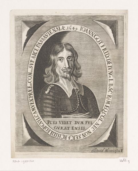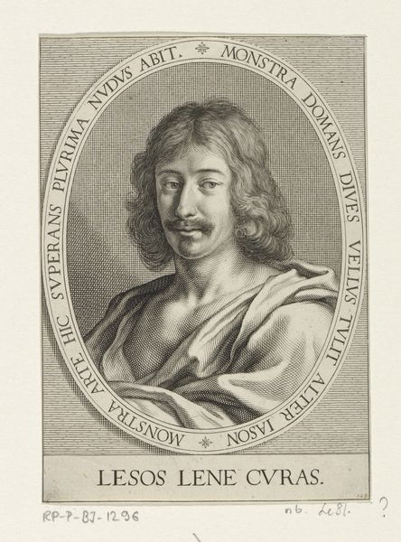 Curator: We're standing before a portrait of Antoine le Maistre, an engraving dating between 1660 and 1715, part of the Rijksmuseum collection. Editor: The first thing that strikes me is the sheer precision of the lines. It almost feels photographic in its detail, capturing every nuance of his face and hair, and yet… Curator: …yet it’s resolutely Baroque in style. The oval frame, the inscription, the almost theatrical presentation of the sitter – all classic elements of the era. This format speaks to the political structures of patronage and nobility that so determined what, and who, was worthy of depiction. Editor: Definitely, but that's precisely where I see an inherent tension. Le Maistre, an avocat, presented with such attention to detail in an artistic expression so obviously for the social elite of the day, makes you wonder: how did social activism operate at the time, if that makes sense? Curator: The inscription does provide context. It identifies le Maistre and his passing, also referring to him as “l’appuy de l’Innocence,” hinting at his role and perhaps how he was publicly regarded. Consider the act of commemorating him like this in this format could have carried considerable political weight. Editor: That’s it! It’s almost as though, in this highly structured, politically-motivated artistic format, it's possible to identify and reify those upholding different values than those typically represented. It speaks to me of visibility and of those fighting on behalf of the underprivileged, almost saying "We see you, and value what you do". Curator: The choice of engraving itself is significant. While perhaps not as glamorous as oil painting, engraving allowed for wider dissemination. The artwork wasn't necessarily made to adorn someone's private chambers; there was, in principle, a wider viewing public for engraved portraits, shaping public opinion in the process. Editor: Absolutely, and I see the power of portraiture operating even within very defined boundaries. Even these portraits helped create discourse and helped promote particular social causes and ideologies to wider audiences. Curator: Exploring art through the lens of the social history in which they are embedded certainly can shift our understanding. Editor: And situating a historical object such as this print in light of contemporary activist theories reveals exciting intersections.