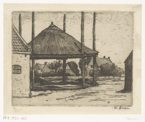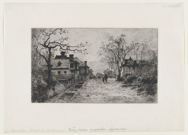Curator: Before us is Arend Hendrik's 1939 etching, "Boomgaard bij Giessendam," a scene preserved for us here at the Rijksmuseum. Editor: There’s a quiet melancholy here, isn’t there? All soft greys, like a half-remembered dream or a very polite ghost story. And what are those odd crucifix-looking structures holding up those trees? Makes me wonder what hidden narratives are lurking here... Curator: These structures and trees establish the picture plane. The eye is lead back along orthogonals to the village—centered at the horizon line and anchored by the church tower. Note how Hendriks balances atmospheric perspective with incredible detail, despite it being a print. Editor: The precision is extraordinary, particularly considering it’s an etching! You can almost feel the grit of the road under your shoes, and imagine the rustling of the leaves on those pruned trees. Makes one feel small, an extra in someone else’s narrative of daily life. Curator: Consider how the cross-hatched shading sculpts three-dimensional form from this flat medium. Observe how he employs different densities of line to suggest depth, varying tonal contrasts in such subtle gradations—a powerful example of realist technique. Editor: And then there's that figure on the road, receding into the village. Just a few strokes and they exist. Maybe the ghost that this whole piece is waiting for! This feels…stilled, poised. All in grey—that wonderful tonal restraint makes one notice how much the ordinary can yield. Curator: It's a landscape, yet simultaneously a meditation on time and place. There is an almost photographic sensibility here that conveys truth of materials: how the road and sky can almost melt into the horizon together in fog. Hendriks gives us a lesson in what good formalism can do. Editor: I feel it as a deeply subjective impression! It’s a scene of life flowing on, indifferent to my own small, present observations. It makes me think that maybe every etching carries not just a depiction, but the echo of an unspoken narrative and some invitation into that narrative, too.