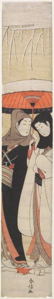 Curator: Here we have "Lovers under an Umbrella in the Snow," a woodblock print by Suzuki Harunobu, dating to around 1767-1768. Editor: Mmm, dreamy. I love the way the falling snow is suggested more than shown, like winter's secret. It’s subtle, a quiet moment shared. Curator: Precisely. This work is an exemplary representation of ukiyo-e, capturing a fleeting moment in everyday life. Consider the social dynamics at play—a samurai, easily identifiable by his sword, sharing an umbrella with a woman in the snow. What could this signify about the relaxed attitudes toward social mobility during the Edo period? Editor: Social mobility or simply...a chance encounter? Maybe they’re old flames, you know, dodging snowflakes and awkward questions. Look at the almost ghostly pallor of their skin against the darker tones; they look like they are lost in thought. Curator: It's possible, of course. But the samurai's presence inherently introduces the themes of class, obligation, and even perhaps forbidden love—all pervasive themes within the ukiyo-e tradition. Notice the woman’s obscured face. To what extent does that reflect the limited visibility and agency afforded to women? Editor: Hmm, limited visibility literally, sure. But she could also be completely comfortable and in control. Sometimes a girl just wants a quiet walk in the snow, shielded from the gaze. The beauty lies in what isn't said, don't you think? That delicate balance of mystery. It makes you want to write poetry about it, really. Curator: Ukiyo-e prints also democratized art; making these images widely available fostered a sense of shared identity. To what degree did these artworks enable a broader discourse surrounding social issues? Editor: Democratized... perhaps. Or perhaps people just saw pretty colors and imagined stories. That's democratizing, too, isn't it? Curator: A fine distinction. It all connects us, doesn’t it? Editor: Makes you want to find someone to share your umbrella with.