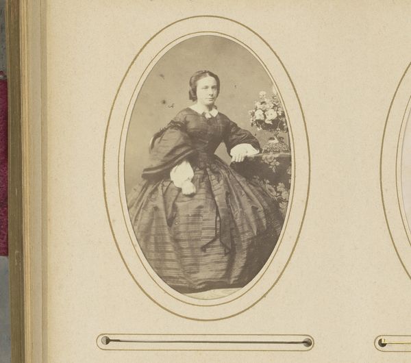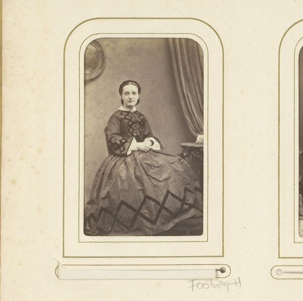 Editor: So, this is a photograph called "Portret van een jong meisje bij een tafel," or "Portrait of a Young Girl at a Table," created by Delehaye & Sluyts sometime between 1855 and 1870. It's an albumen print. There’s something so stiff and formal about it… a really stark contrast to how we take pictures today. What strikes you when you look at this? Curator: Well, beyond the stark formality you mentioned, I see a very deliberate layering of materials and labor. Look at the backdrop – clearly painted. The set is manufactured, presenting a fantasy of nature, likely to offset the industrializing world of the sitter. This creates a strange tension with the 'real', posed girl. Editor: A manufactured nature, that's interesting. Curator: Exactly! And consider the young girl’s clothing – the fabric, the labor involved in its making, probably not her own… Who produced this dress? And who benefits from it? This isn't simply a portrait; it's a record of Victorian-era consumption and the means of production. The very materiality of this image– the albumen print itself– involves a complex process, revealing the chemical industry burgeoning at the time. What do you think of the object itself being so prized and durable? Editor: I guess I hadn’t thought about it that way. So much intention and artifice baked into what seems, on the surface, like a straightforward image. To consider this photograph as an item shaped by cultural practices makes you wonder about the power dynamic it represents. Curator: Precisely! It shifts our perception from passive observer to active interrogator, considering how class, labor, and technology intersect to create even seemingly simple images. This era created not just artworks, but items shaped by economic realities.