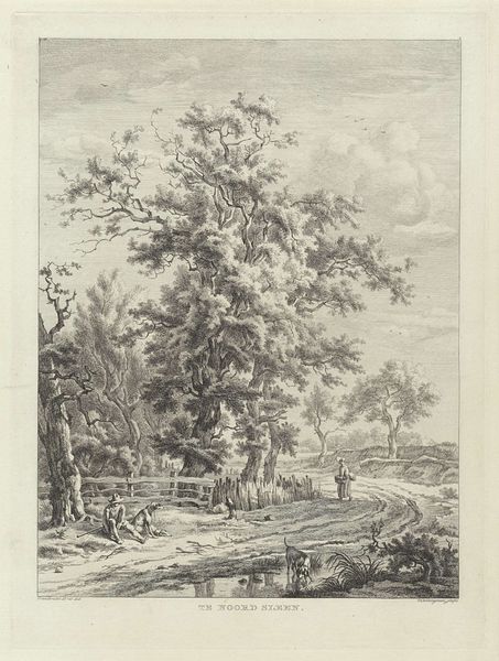 Editor: So, this is *Landscape with Hunter and Dog*, an etching made between 1760 and 1771 by Nicolaas Albrecht. The level of detail achieved with just etching is amazing. What’s particularly striking is the sense of everyday life Albrecht captures, though it also seems to suggest a larger, maybe even ideological, worldview is subtly layered in. What do you see in this piece? Curator: It's fascinating how Albrecht uses seemingly simple imagery to tap into deeply ingrained cultural narratives. Think about the hunter. He's not just a figure in the landscape, he’s a symbolic representation of man's dominion over nature. This resonates with a long history of power dynamics depicted through hunting scenes, right? Editor: Absolutely. So, the act of hunting here…it’s not merely about sustenance, it’s a display of control. What does that say about the period? Curator: It speaks to an era grappling with concepts of ownership and hierarchy. Notice how the bridge subtly connects different realms - the cultivated landscape with the wilder parts. It implies transition but also reinforces the idea of man mediating between civilization and the untamed. What feelings does it evoke for you? Editor: It evokes a bit of nostalgia, or even perhaps some pastoral fantasy, like idealized rural bliss, contrasted with the control imposed on the land and its inhabitants. It feels almost contradictory! Curator: The artist captures something profound in that contradiction: humanity simultaneously yearning for freedom and exerting its will upon the world. Seeing how it is achieved using very simple lines reveals it’s also about the process by which meaning can be extracted and created through symbols, regardless of the form those symbols take. Editor: I never thought I'd see such symbolism lurking in what looks like just a scene of a hunter walking with their dog. It is really powerful.