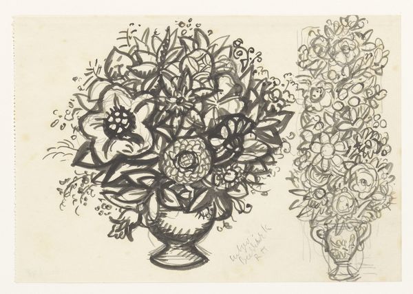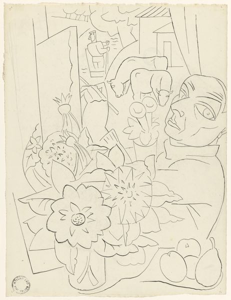 Leo Gestel made this pencil drawing, ‘Flower vase on a table’, at an unknown date. The vase is centered on a simple table, topped by a mountain-like form and two birds. The drawing is an interesting illustration of the tensions of the artist’s time. Gestel was working in the Netherlands at the turn of the century, when academic realism was being challenged by modern movements. There was considerable debate about the public role of art, and the values it should embody. While he did not fully embrace pure abstraction, Gestel was influenced by the expressionist and cubist styles. Note the way the flowers and birds are reduced to simplified forms, and the lack of depth or naturalistic color. We might think of Gestel as questioning the traditional role of still life painting. Instead of representing luxury and abundance, this drawing feels deliberately sparse and provisional. To understand Gestel’s motivations better, we might look at his other works, read contemporary art criticism, and research the exhibition history of the time.
