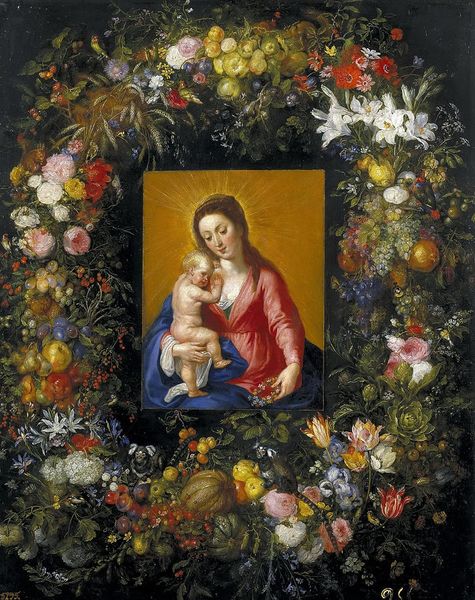 This is The Virgin and Child Encircled by a Garland of Flowers Held, painted by Jan Brueghel the Elder in the early 17th century. It represents the Virgin Mary holding the infant Jesus, surrounded by a wreath of flowers and cherubic figures. Paintings like these reflect the religious and social climate of the time, particularly in the Spanish Netherlands, where Brueghel lived. As a Catholic region under Spanish rule, there was a strong emphasis on religious imagery, particularly of the Virgin Mary. This was, in part, a response to the Protestant Reformation, where such imagery had been rejected. The painting's floral garland is also notable. In this period, flowers were not only beautiful but also carried symbolic meanings. By depicting the Virgin Mary surrounded by flowers, Brueghel draws on these symbolic associations, reinforcing her virtues and importance within the Catholic faith. Understanding the historical context is crucial to interpreting art, and by consulting historical texts and records, we can gain a deeper understanding of the social and institutional forces that shaped its creation.