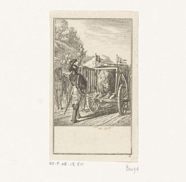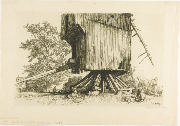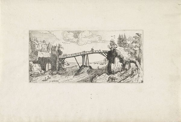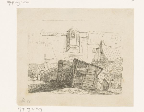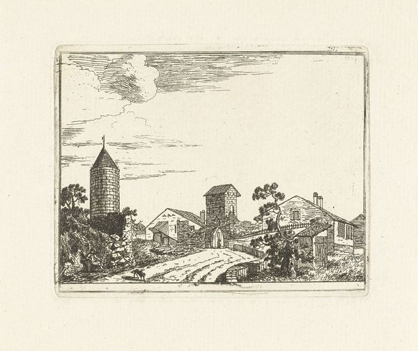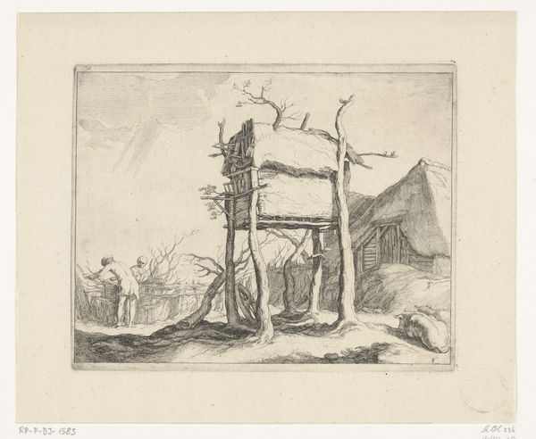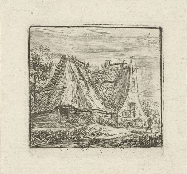 Editor: This etching, "Man on the way to a house," by Johannes Ludovicus van den Bos, from around the 1820s, presents such a quaint little scene. It feels quiet and a little lonely, perhaps due to the stark shadows. What do you see in this piece, especially regarding the symbolism? Curator: I see the enduring allure of 'home,' etched here not just in ink, but in collective memory. The house itself, nestled in the landscape, is an archetype—a visual shorthand for security, family, and belonging. Look at the man; he's heading towards that symbolic center. But what is he carrying? Is it burden or a treasure? The etching doesn’t reveal. Editor: That's interesting! I hadn't thought about what he might be carrying – it looks almost like nothing? Is that shadow a kind of burden, maybe? Curator: The shadow, indeed, adds depth, literally and figuratively. Shadows often represent the unknown, the unconscious aspects of life, or even mortality. Could van den Bos be hinting that the path to ‘home’ is always walked alongside our own shadows? Notice the materials making up the landscape - they're temporary, makeshift. Editor: I see that, like boards are stacked temporarily. I guess it feels like a home being made, not one fully realized yet. Curator: Precisely! And that evokes a powerful emotional response. It highlights the ever-present human desire to construct, to nurture, and to find or create a sanctuary, even amidst impermanence. The symbolism resides in the process. It encourages viewers to look beyond the immediate depiction. Editor: Wow, that makes me see it completely differently! From a simple etching to this really thoughtful meditation on home. Curator: The beauty of art, isn't it? It evolves as we do. It gives me a deeper appreciation. Thank you!