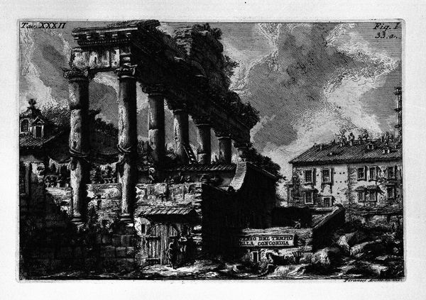 Giovanni Battista Piranesi made this etching, "Interior view of the Temple," using metal plates and acid. Look closely, and you will notice the level of detail that Piranesi created through the etching process. The textures of the stone, brickwork, and vegetation are captured with remarkable precision. The artist employed a combination of techniques, including hatching and cross-hatching, to create depth and tonality, giving the print a three-dimensional quality. The lines vary in thickness and density, adding to the overall sense of drama. Piranesi used his skills as a draughtsman to produce accurate and highly detailed prints for sale to tourists and collectors. The printmaking process allowed for the mass production of these images, making them accessible to a wider audience. By emphasizing the materiality and labor involved in printmaking, we can understand the artistic, social, and economic context in which these images were produced.