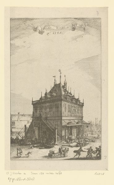 Curator: Before us we have Jean Théodore Joseph Linnig's pen drawing, "Straatgezicht met oude gebouwen en een klokkentoren," created in 1849. Editor: My first impression is one of austere beauty. The intricate details rendered in pen give it an almost photographic quality despite the soft light and shadows. The tower's verticality dominates, doesn't it? Curator: Absolutely. Linnig presents a street scene with the clock tower as a visual and social marker. It would be interesting to research what role this city played at the moment of profound economic and social upheaval. Its imposing architecture almost seems to watch over a place undergoing constant renegotiations of power and labour. Editor: You're right; there's a stillness to it. The meticulous details, like the texture of the stone and the linear precision of the tower’s spire, feel almost mathematically pure. Do you think this reflects something about Linnig’s view of urban planning at the time? A hope for stability amidst change? Curator: Possibly. We must also consider the broader socio-political context of 1849. Europe was still reeling from the revolutions of 1848, driven by demands for social change and economic justice. Consider also that this area of Belgium saw massive spikes of immigration as peasants began searching for labor, particularly seasonal laborers working in France. Editor: The gate acts like a frame, inviting you to enter the marketplace beyond and see figures actively engaged in commerce and negotiation. It's beautifully rendered. There's something compelling about the composition’s balance and clarity. Curator: Precisely. So much of its visual identity rests on our current context. How often are such street scenes occupied with informal and formalized commerce, or subject to protests against capitalist powers? Editor: Indeed. It shows us how, through formal representation, Linnig also provides a lens for scrutinizing shifting political climates and ideologies through history. Curator: It reminds us that what appears to be a simple street scene is, in reality, a reflection of a constantly shifting social order.