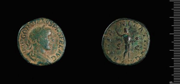 Editor: Here we have the Sestertius of Gordian III. Looking at it, you can really see the wear and tear of time on this coin. What do you see in the materials of this work? Curator: I see a direct link to the Roman economy. The bronze used wasn't just a pretty material; it represented the state's control over resources, labor, and trade networks. Each strike of the die was a form of authorization! Editor: That's fascinating! So, the material itself tells a story of power and process? Curator: Precisely. It pushes us to consider the socio-economic systems at play, more than just artistic expression, wouldn't you say? Editor: Absolutely. I didn't think of a coin in this way, the value of labor and material as a statement. Curator: Indeed, we can now look at the coin with different eyes.