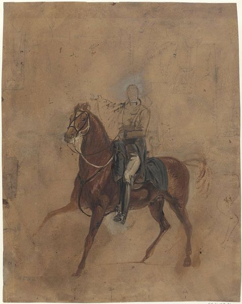 Curator: My initial reaction is that it feels very... dreamlike, ethereal. The soft palette, almost monochromatic, adds to the sense of a fading memory or a story told long ago. Editor: We’re looking at "Ridder op een schimmel," which translates to "Knight on a Grey Horse". It’s attributed to Ferdinand Ernst Lintz and was created sometime between 1843 and 1909. He seems to have explored the themes of romanticism through the perspective of academic art. The materials appear to be watercolor and perhaps some charcoal or colored pencil. Curator: The way the artist handled the horse's coat – it’s almost luminous! As if it's not just paint but capturing some inner light. You can almost feel the softness. The knight’s armor, however, seems rather...uninspired, almost clumsy compared to the horse. Editor: Interesting. Lintz was painting in a period where historicism was quite fashionable; it provided visual anchors for national and cultural narratives. Depictions of knights, regardless of their execution, often served as symbols of bygone eras and national pride. Even though it's only a watercolour. Curator: So it's less about realism and more about evoking an ideal? That would make sense! I see it less as a representation of any specific historical event and more as a contemplation of a certain… chivalric essence. An idealized past that probably never truly existed. I see also references to landscapes art; he probably painted “plein air”. Editor: I think the looseness of the rendering supports your idea of evocation over depiction. There's definitely an air of longing present, which makes me wonder about the intended audience and how they might have perceived this idealized image during a time of rapid social change. I can imagine this knight symbolizing perseverance in a world they felt was crumbling, or even of dreams unrealized. Curator: Right. There is this tension: it is at the same time really suggestive and illustrative. A watercolor that holds, though slightly fading, the power of a dream. Editor: A dream perched, perhaps precariously, on the back of historical representation. Fascinating!