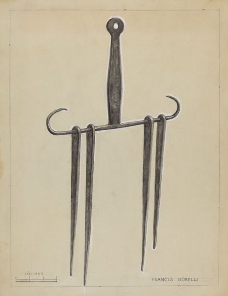 Editor: Here we have Mildred Ford's "Rush Light and Candle," a drawing in pencil on paper, dating from around 1937. It has a sort of stark, utilitarian beauty, if that makes sense? What strikes you when you look at this drawing? Curator: Well, immediately I'm pulled in by its almost eerie simplicity. A rush light—such a basic, fundamental tool for pushing back the dark. I see a quiet testament to ingenuity and, perhaps, a stark reminder of a not-so-distant past when light wasn't just a flick of a switch away. Makes you wonder, doesn't it, what stories that light might have witnessed? Editor: Definitely. And I'm curious about her choice to draw this subject. Was there something particularly special about it, or just a mundane object worth capturing? Curator: Perhaps both. I'm betting Ford found a certain sculptural elegance in the object itself. It is, after all, rendered with a tender hand; see the subtle gradients and shading on the metal and paper. The subject of her sketch hints at something elemental. I see here more than simple documentation; it's as though she sought to capture not just the *thing*, but also the *essence* of resourcefulness. What do *you* reckon? Editor: That's interesting; the 'essence of resourcefulness.' I was so caught up in the plainness of it, I missed that depth. Now it really feels different, less ordinary. Curator: See, that’s the lovely magic of art, isn't it? To transform something commonplace into something… more. And it gets us reflecting. Editor: Absolutely. I will not look at mundane tools again in the same way, that’s for sure!
