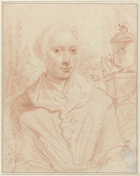 Curator: Here at the Rijksmuseum, we have a delicate self-portrait by Tethart Philip Christian Haag, created sometime between 1757 and 1812. Editor: The first thing I notice is the texture of the graphite on the paper, creating soft shadows on the subject’s face. It gives him an almost ghostly presence. Curator: Graphite was becoming increasingly common at the time. It was celebrated for being easily erasable, which fostered a culture of sketch and preliminary studies and further lent itself to intimate works. Haag's self-image exists in the shadow of the French Revolution. His family fortune would later be decimated as the old institutions started to collapse. Editor: Absolutely, but let's consider the direct application of that graphite too. Note the confidence, and quick strokes around his clothing. There's an almost journalistic impulse at play. What labor went into obtaining such materials? Were these new technologies trickling into everyday society at the time? Curator: I agree that the seeming effortlessness is notable, but it's equally fascinating that Haag inscribed the bottom of the drawing with his name and title as "Director of the Drawing Academy." To me, this signifies the increased institutionalization of artistic training at the time. The academy served to set standards, train artists, and legitimize artistic practices. It was also about power. Editor: Interesting, and definitely pertinent to his choice to leave such a mark for future scholars, however his light strokes of material capture a vulnerability often lost on high academia at the time. His eyes almost seem to plead with his contemporary or present gazers, a quality likely resulting from the use of graphite in drawing. Curator: A sensitive reading, indeed! It is tempting to view the piece through a materialist lens; however, this portrait showcases artistic identity formation through institutional position during turbulent political times. The play of shadow in romanticism as it struggles to legitimize its existence and future. Editor: Indeed, perhaps we both shed new light on Mr. Haag's contribution to the artistic landscape in a revolutionary time!