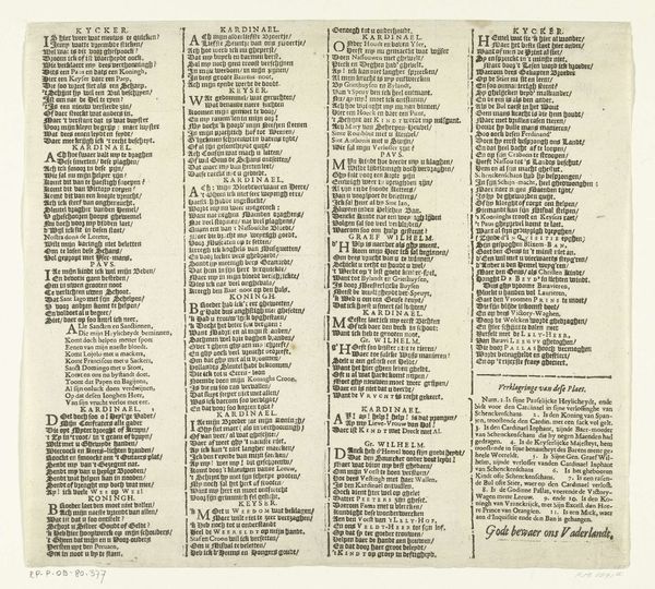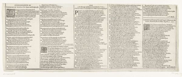 This is a broadside, a single sheet printed in 1635 or 1636. It was created by an anonymous printmaker, using a printing press. Consider that printing was a relatively new technology, and broadsides like this were a form of mass communication, offering news, commentary, and propaganda. This particular broadside comments on the end of the siege of Schenkenschans, a strategically important fortress. Look closely at the dense blocks of text, the decorative borders, and the overall design. The printer would have carefully arranged the type, inked the press, and pulled each sheet by hand. The material qualities of the paper, the ink, and the typography all contribute to the broadside's overall effect. The regularity and density of the type demonstrate both precision, and a sense of urgency. The creation of such a print reflects the rise of a print culture, and a growing literate public, where information was disseminated more widely than ever before. Approaching this image in this way challenges the traditional distinction between fine art and the printed word, emphasizing the social and historical context in which it was made.