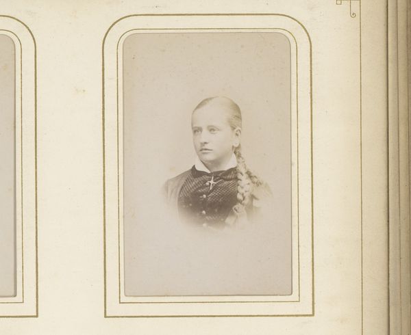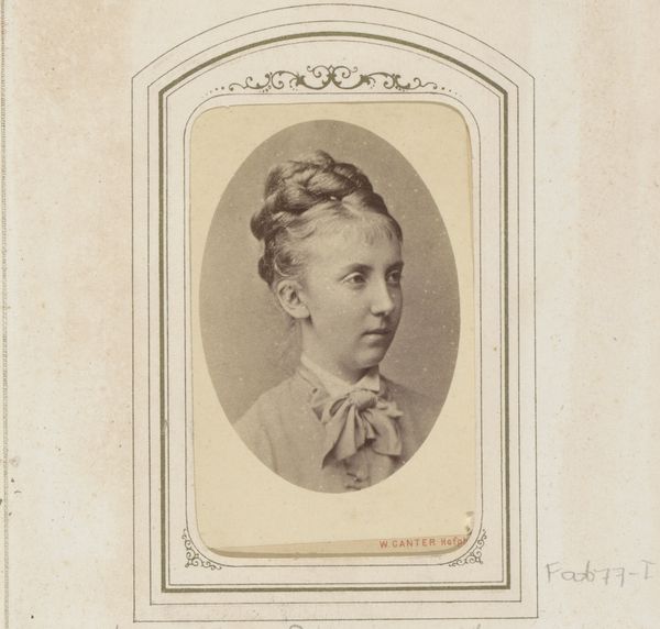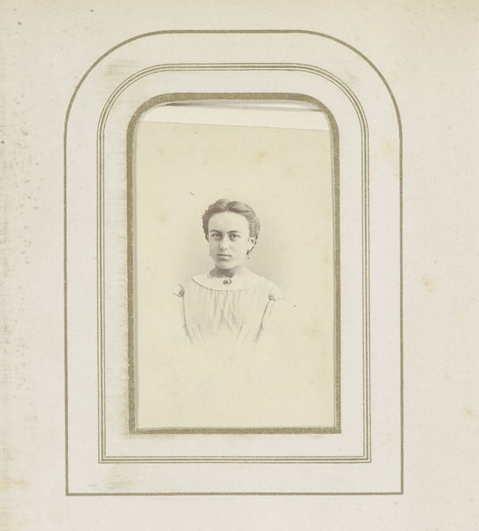 Curator: I'm immediately struck by the quiet intensity in this young woman's gaze. The albumen print lends the image a hazy, almost ethereal quality, making it feel both immediate and distant. Editor: It’s an arresting image, isn't it? This is “Portret van een jonge vrouw” – Portrait of a Young Woman – dating from between 1860 and 1880, by Hendrik Anthonie Karel Ringler. A stunning piece of historical photography. It prompts us to consider the social constraints and gendered expectations placed upon young women in the 19th century. Her clothing, that high-necked dress buttoned so demurely, speaks to a very particular performance of femininity. Curator: You’re right about the costuming. The placement of the buttons draws attention directly to her chest, but also shields it—presenting a compelling dichotomy, something both suggestive and extremely demure. Editor: It is suggestive of both promise and containment. How much power do you think she actually held within the domestic sphere? Photography itself was democratizing, but the codes of conduct remained firmly entrenched. She performs compliance, perhaps, while also hinting at nascent individuality through the unwavering quality of her gaze. What do you think that small black ribbon says about status and social identity at this time? Curator: Visually, the ribbon offers a stark contrast. It frames her neck in a manner that almost suggests defiance, a small but potent break in the pastel shades and the overall uniformity. Ribbons as markers of status have existed for ages, although a plain ribbon like this might suggest a more restrictive circumstance, like a period of mourning. Editor: Fascinating to consider. Does that oval frame surrounding the portrait affect your interpretation at all? It feels simultaneously protective and imprisoning, like a Victorian locket. Curator: Absolutely. It reinforces this sense of containment we spoke about before, presenting her as an object, contained and presented for public consumption. She's been positioned very deliberately for posterity. This portrait reminds us that the act of image-making can also be an act of control. It offers an extremely fertile space for examining themes of power, visibility, and representation through an intersectional lens. Editor: Ultimately, though, she defies being completely contained, doesn't she? The emotional complexity that pierces through leaves us wondering what life choices she might have made outside the frame.