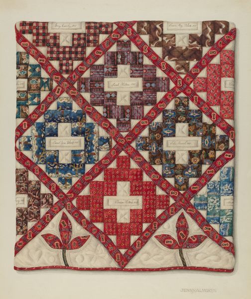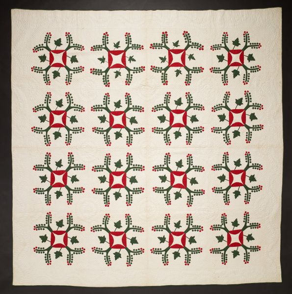 Curator: Looking at this LeMoyne Stars quilt, likely crafted between 1880 and 1890, the overall impression is a feeling of constrained joy. The geometric rigor somehow amplifies rather than diminishes its visual power. Editor: It does strike me as almost severe. The intense repetition, the starkness of the red, white, and blue cotton… it’s quite imposing. I’m immediately thinking of the labor that went into creating this meticulous object, and how such acts of making transformed raw materials into something of significance. Curator: Exactly! I read this textile as speaking to themes of identity, particularly given the prominent use of colors that later became deeply intertwined with American patriotism. And the anonymous nature of its maker begs the question, "Whose history are we really seeing represented here?" The act of quilting has often been overlooked within official accounts of art history, and yet, it held huge social and political importance. Editor: It speaks to ingenuity born from necessity, I believe. It represents how cloth remnants could be repurposed and the skills needed, passed down often through generations. Each stitch carries within it this potential history, from the fields where the cotton was grown, to the markets where the fabric was sold, to its final purpose in daily lives. How does its placement within an art institution alter that intrinsic social narrative? Curator: By elevating it from utilitarian object to artwork, we create the space for these questions. What does it mean for traditionally undervalued domestic craft to find its place within our institutionalized notions of value? Is it folk art, or is that just another construct that reinforces an outdated canon? Editor: Absolutely, and perhaps its presence encourages us to reconsider where and how the divisions between "high art" and the everyday collapse. After all, a quilt served not just aesthetic purpose but also profound functional and communal roles within society. Curator: And so by deconstructing the systems that govern what we recognize as "Art" and investigating the conditions of its production and consumption, as this beautiful quilt does, perhaps we make room for wider, more nuanced perspectives. Editor: I agree, by considering process and context, and by questioning entrenched values, we allow more equitable voices and material narratives to rise to the surface. The experience makes you question what you think art is and what materials mean when combined with labour.